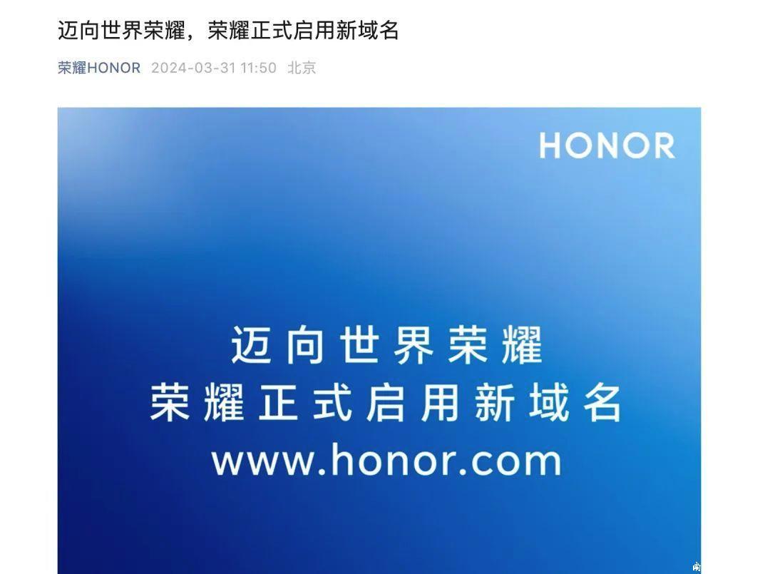 3月31日,南齐湾财社记者获悉,荣耀结尾有限公司告示在全球领域内负责更换域名,由此前的“hihonor.com”变更为“honor.com”。