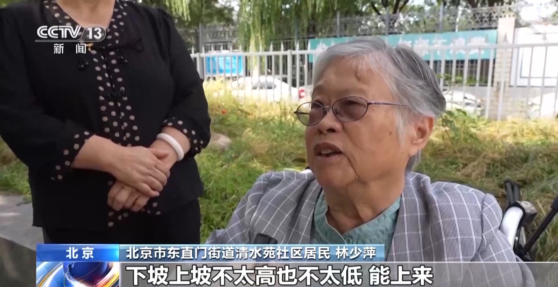北京市东直门街谈净水苑社区住户 林少萍:坐轮椅的到这儿照旧挺任性的,下坡不太高也不太低,能上来。