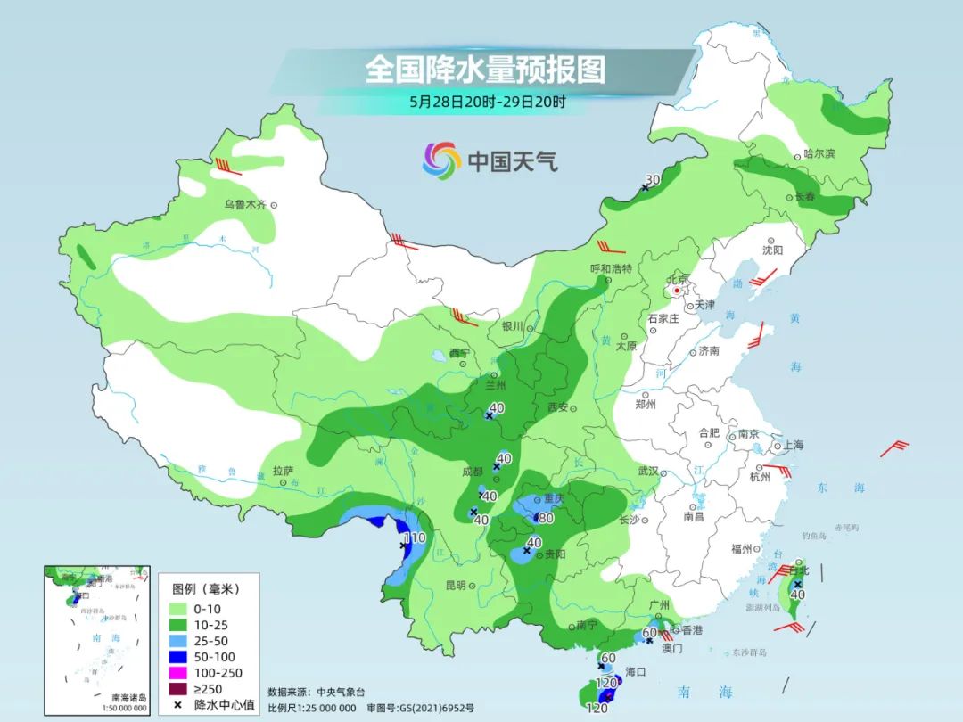 其中,今后三天,西南地区东部至华南一带有较强降水。今天夜间到未来,西南地区东部和北部、云南西北部、华南南部沿海和海南岛、台湾岛中东部等地部分地区有中到大雨,西藏东南部、重庆西南部、贵州西北部、云南西北部、广东西南部沿海、海南中东部等地部分地区有暴雨或大暴雨。